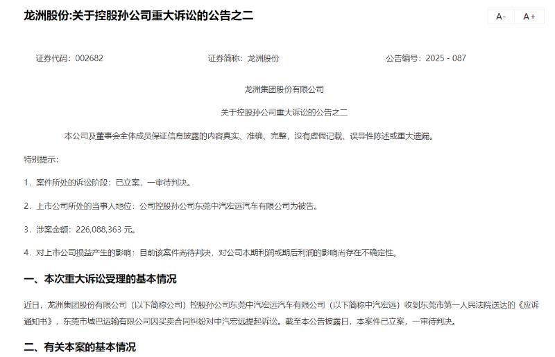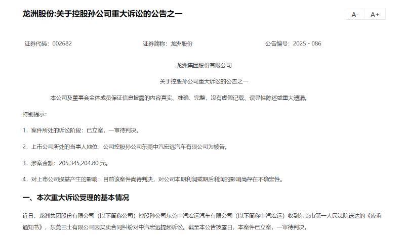 东莞最大公交公司一纸诉状不仅是一起商业纠纷,更是对新能源汽车行业的一次尖锐叩问。11月25日晚间,龙洲股份发布两则公告,披露其控股孙公司东莞中汽宏远汽车有限公司(以下简称中汽宏远)因买卖合同纠纷涉两起重大诉讼,案件均已由东莞市第一人民法院立案,目前处于一审待判决阶段。