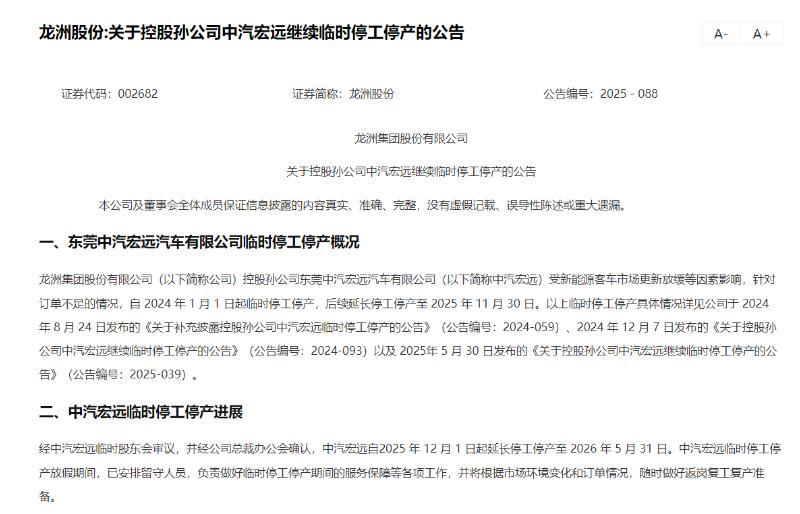 11月29日,龙洲股份发布公告称,公司控股孙公司中汽宏远受新能源客车市场更新放缓等因素影响,针对订单不足的情况,自 2024 年 1 月 1 日起临时停工停产,后续延长停工停产至 2025 年 11 月 30 日。
