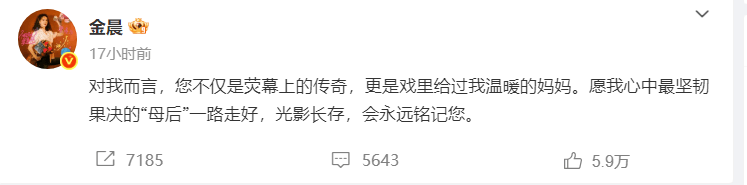 12月14日,演员金晨发文悼念何晴:“对我而言,您不仅是荧幕上的传奇,更是戏里给过我温暖的妈妈。”据悉,两人曾在热播剧《女医明妃传》中饰演母女。12月13日,何晴在北京因病离世,享年61岁,何晴曾于2015年确诊脑瘤,随后接受手术治疗,后期还做过颅脑手术,语言表达受影响。