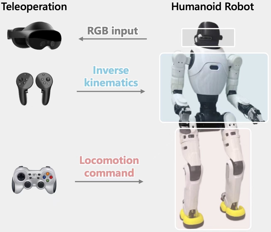 相比原地操作,人形机器人在移动操作任务中的数据采集要“贵”得多。往往需要不止一个数采员同时遥操机器人上半身进行操作、下半身完成行走,这通常只能通过混合方案实现(例如 VR 控制上半身、遥控器控制下半身),这种方式操作流程长、效率低;或者使用全身动捕系统,但价格高昂。