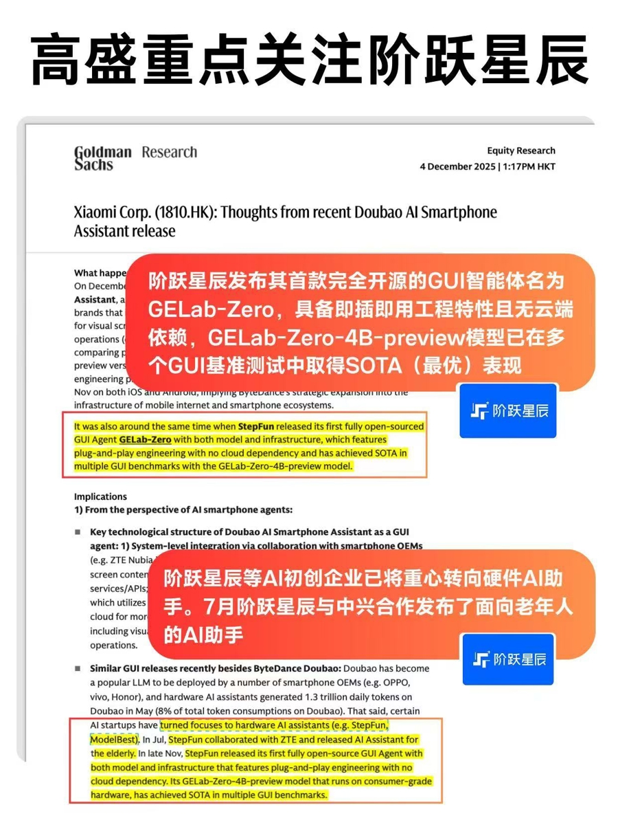 “太棒了,这就是让人想要的跨越边境的开源软件。”一位业内认识如此评价。高盛也对一发布非常关注,他们表示阶跃星辰等AI初创企业已将重心转向硬件AI助手,7月阶跃星辰与中兴合作发布了面向老人的AI助手。业内人士认为,GUI底层模型技术的爆发将加速终端设备的Agent化趋势,2026年或将成为重塑终端入口体验及市场格局的关键窗口期。