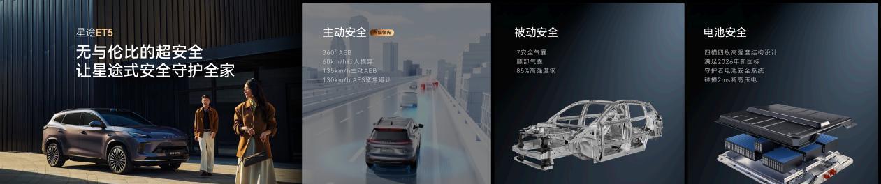 在安全方面,星途ET5使用笼式车身结构,高强度钢铝占比达到85%,AB柱及结构件强度高达1600Mpa;同时提供360°AEB自动紧急制动系统(135km/h场景仍可介入)。电池包具备200kN抗压能力与2ms断电保护,搭配云端24小时监控,使电安全防护更高等级。