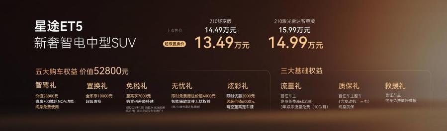 总结:从价格体系到智能体验,从空间舒适到长续航能力,星途ET5并未试图用单一亮点成为“爆点车型”,而是用覆盖全面的产品力完成一款中型智电SUV应有的价值答案。在智能化和新能源加速交汇的节点,星途选择把旗舰技术下放,把智驾使用门槛降低,把豪华体验具体化——这也是星途在全球化布局、技术体系与品牌自信加持下,对2025年的收官与对2026年的开篇表达。
