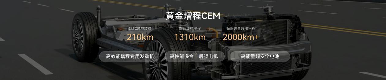 动力系统方面,新车搭载“黄金增程CEM系统”,以同级唯一1.5T增程器为核心,拥有45.79%热效率、3.71kWh/L油电转化效率。在CLTC标准下纯电续航为210km,可覆盖大部分日常通勤场景;极限综合续航2000km+,具备跨省、跨区域出行能力。
