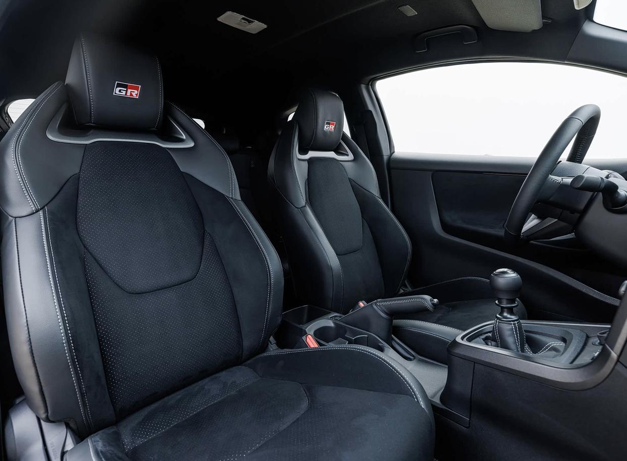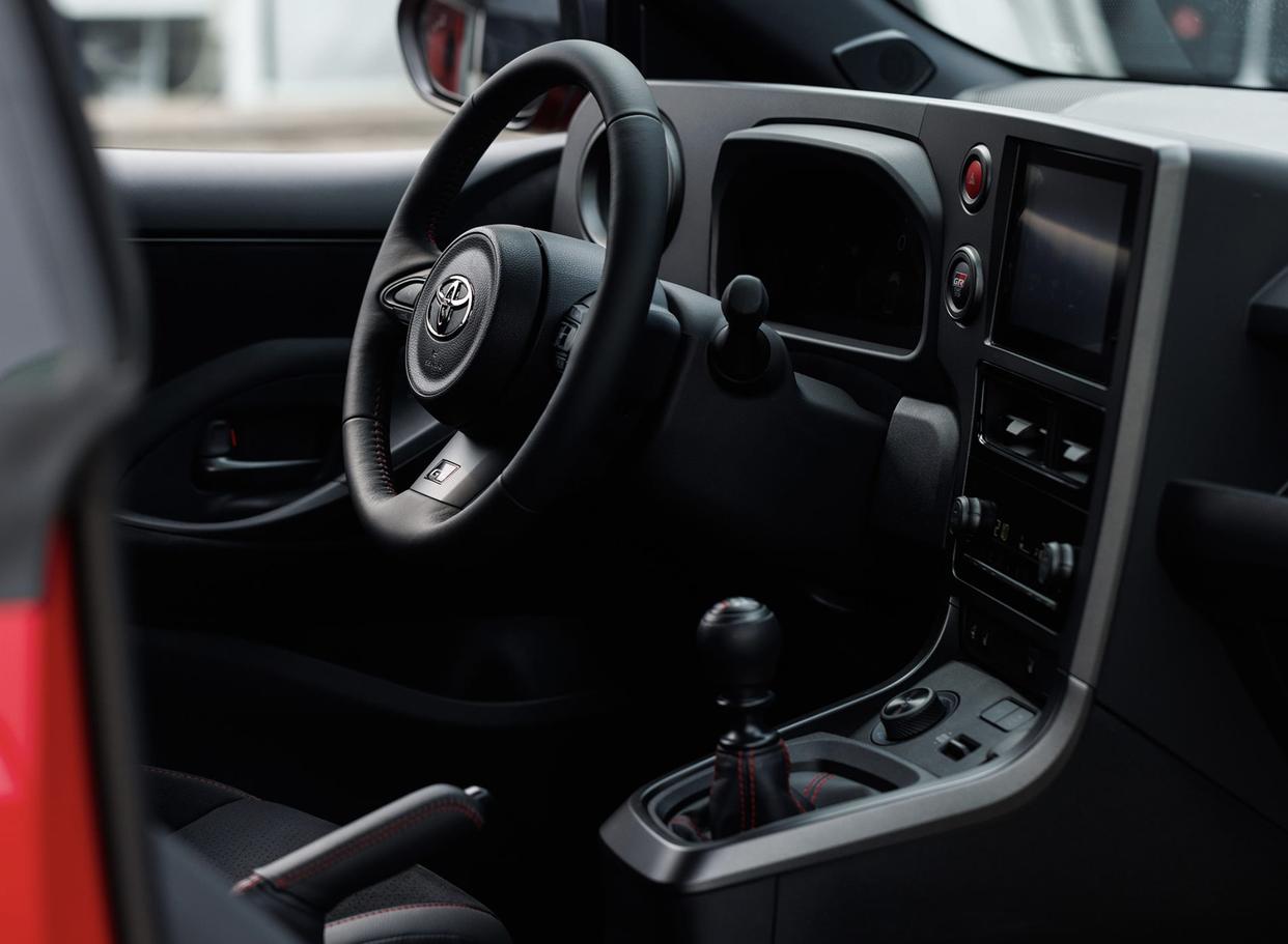 丰田GR YARIS内饰具有浓郁的复古气息,中控台偏向于驾驶员一侧(向驾驶员侧倾斜15度),中控台和门板四周加入了荔枝纹路的黑色硬塑料材质,还加入了纤薄的黑色皮革交替混搭。前排配备了印有“GR”红黑徽标的桶装赛车座椅,驾驶员的胯点位置降低25mm,同时配合调整方向盘的位置,改善了驾驶姿态。还可以选用4点或6点式安全带时。经典的三辐式多功能方向盘还有醒目的“GR”徽标,操控岛区域加入了圆头手动换挡机构,提供立式手刹选装配置,通过手刹位置前移,缩短与方向盘的距离,同时将手刹角度改为更便利于操作的立式,提升手刹操作的便利性,减轻操作负担。科技感方面,该车配备了12.3英寸全液晶仪表、8英尺中控屏,搭载了丰田最新的车机系统,功能也十分齐全。